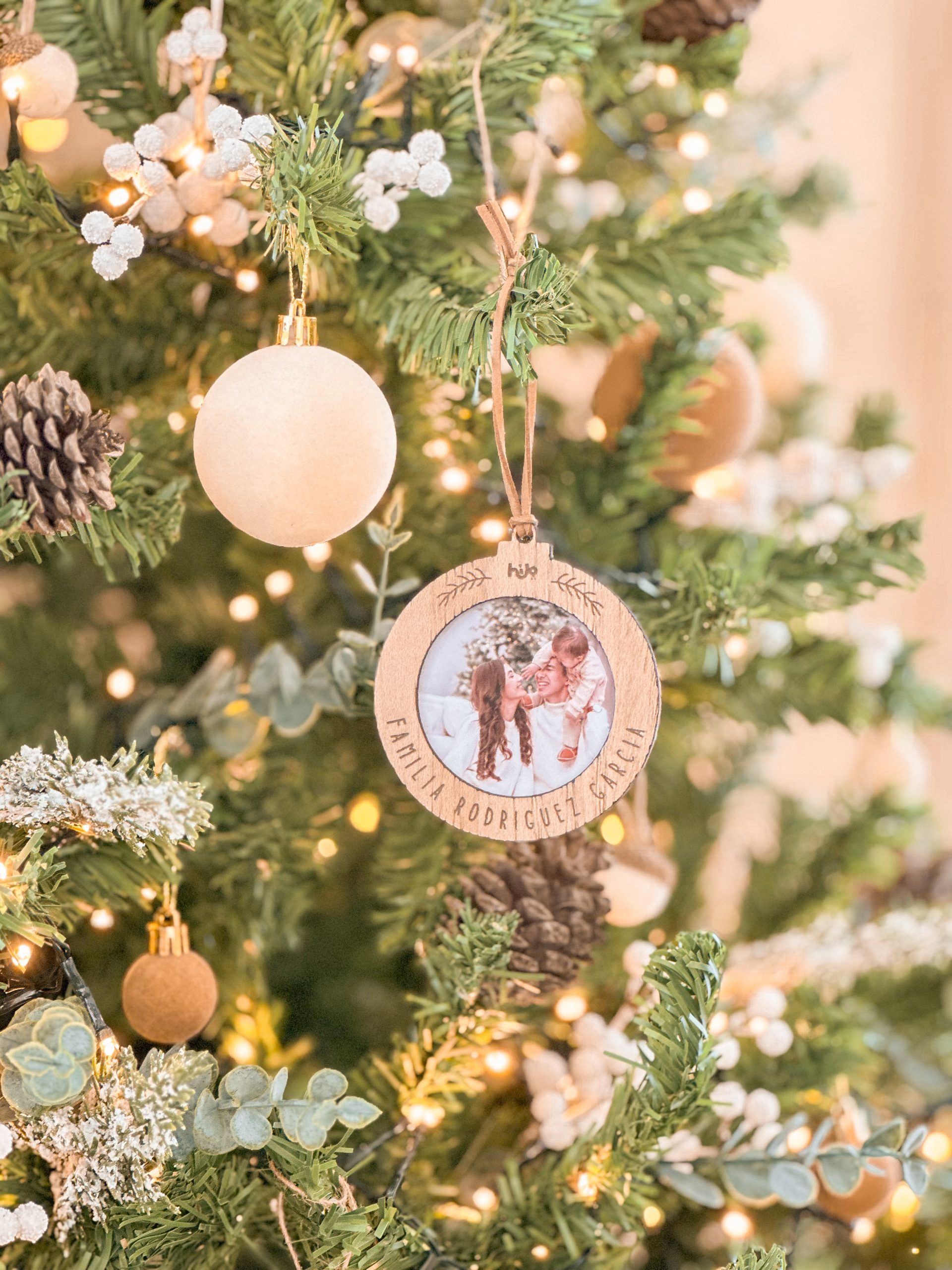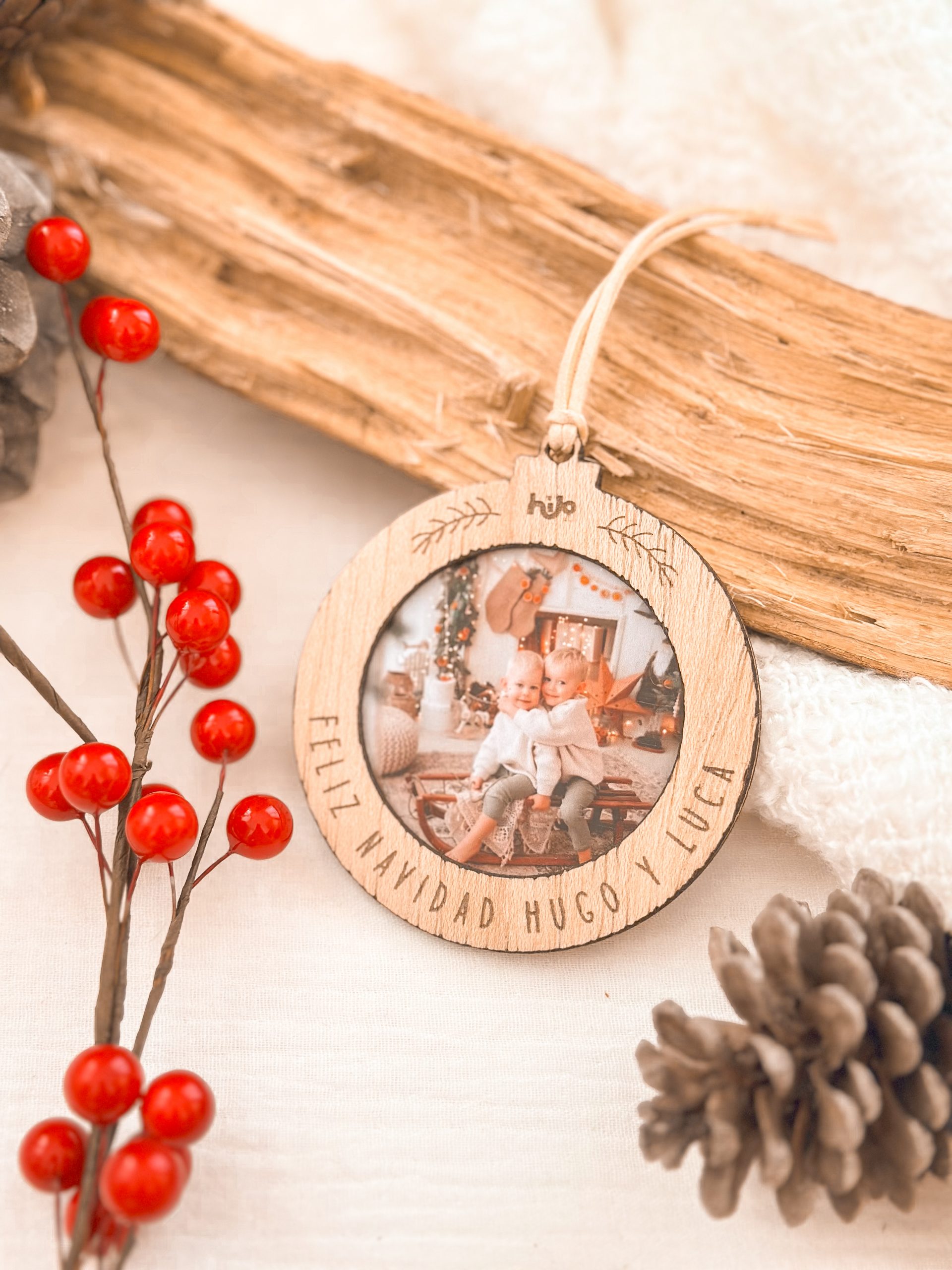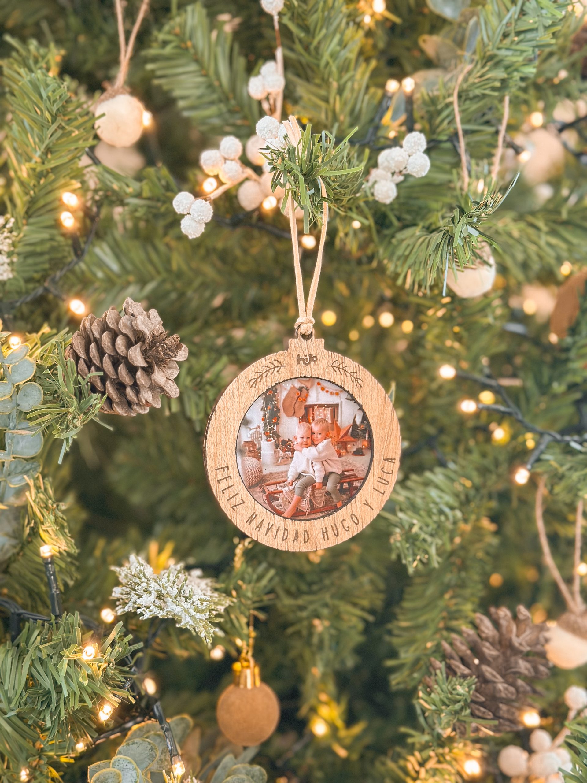 Regala magia en Navidad con esta bola de madera con foto y  el nombre de cada miembro de la familia  ¡Tendréis unos adornos para el árbol de lo más originales y únicos! Y también podéis elegir el color de la cinta para colgarla.