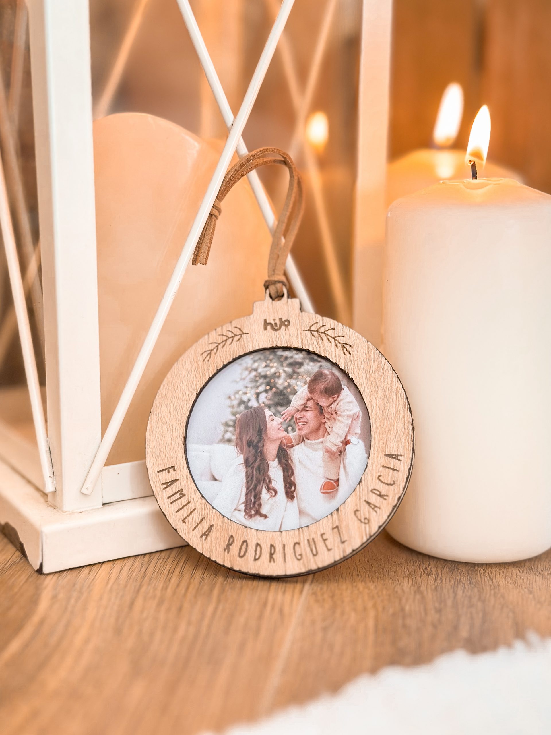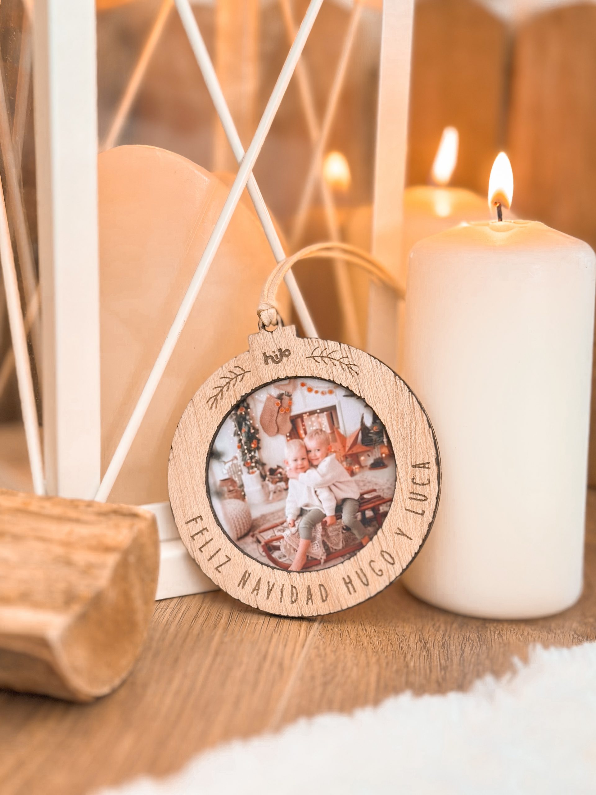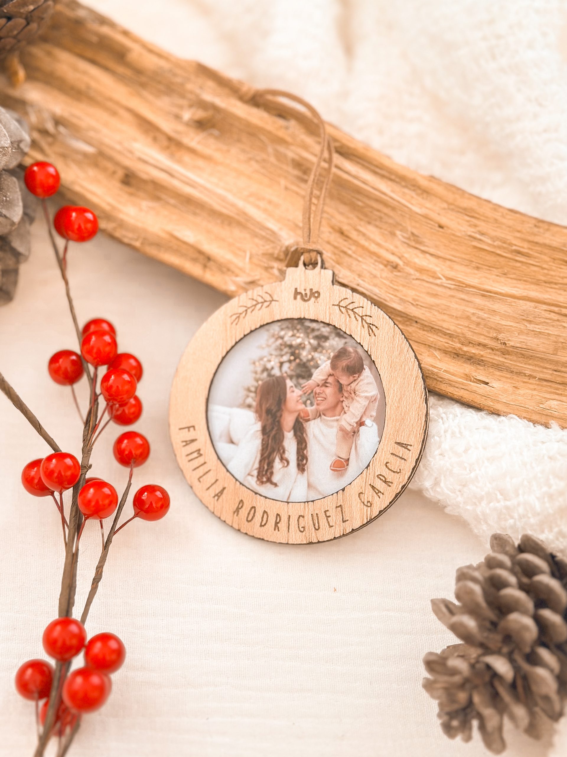 Regala magia en Navidad con esta bola de madera con foto y  el nombre de cada miembro de la familia  ¡Tendréis unos adornos para el árbol de lo más originales y únicos! Y también podéis elegir el color de la cinta para colgarla.