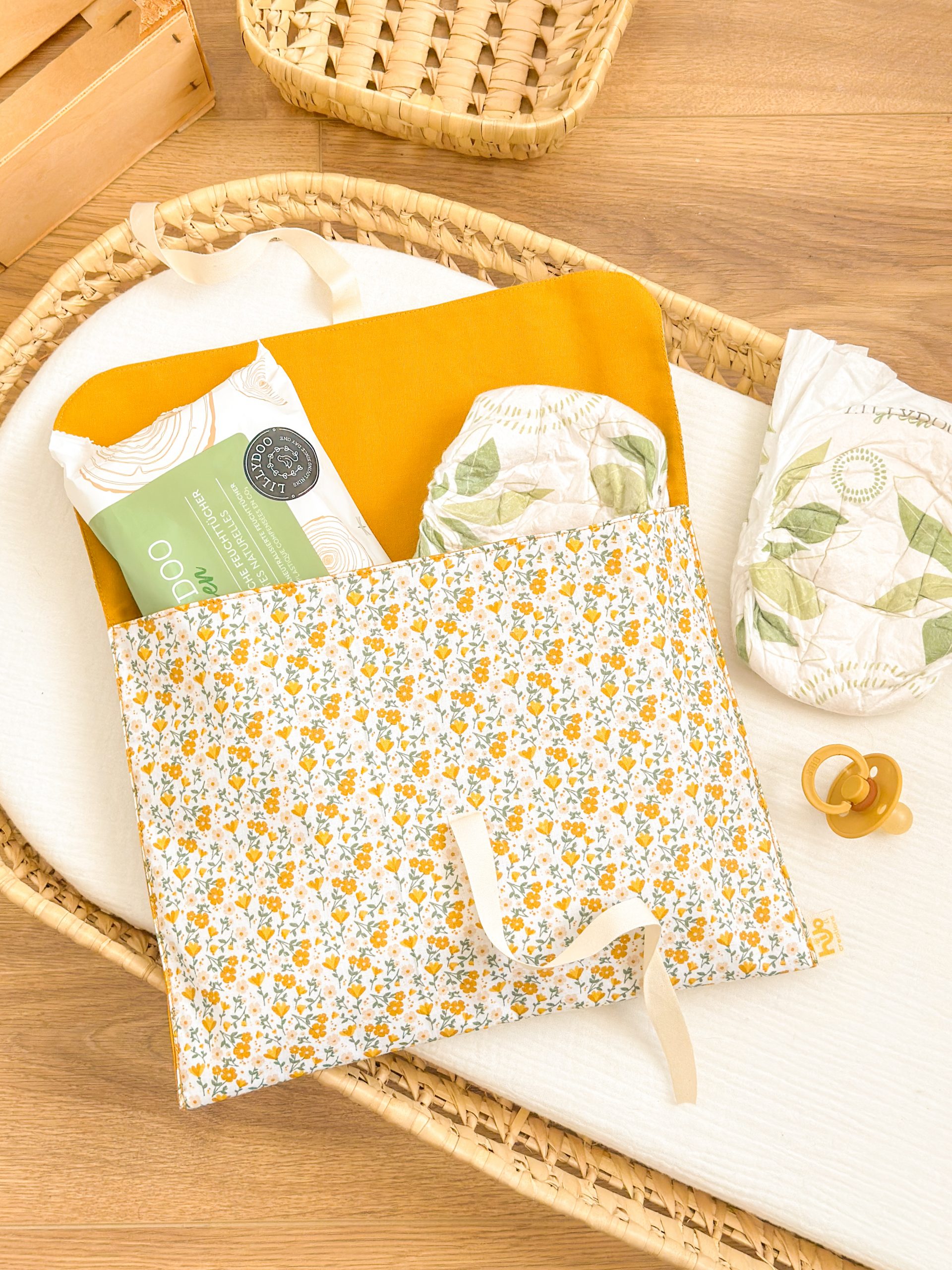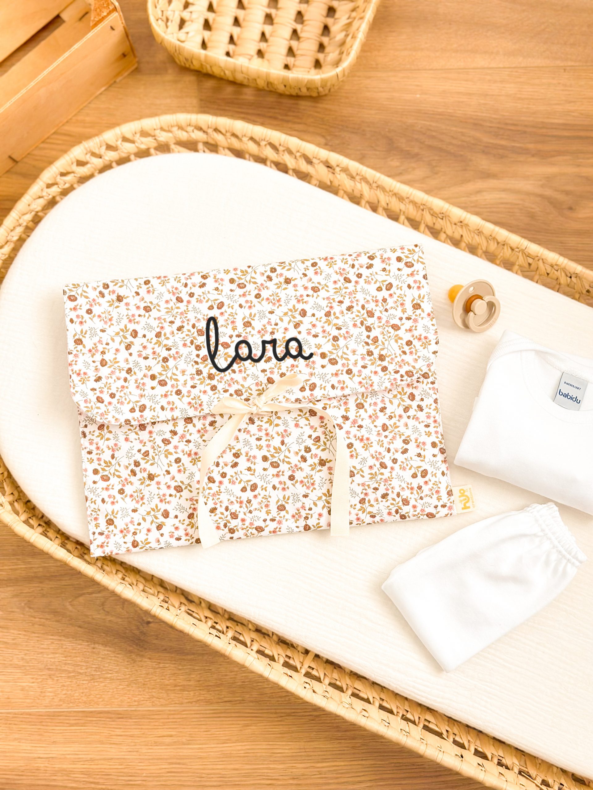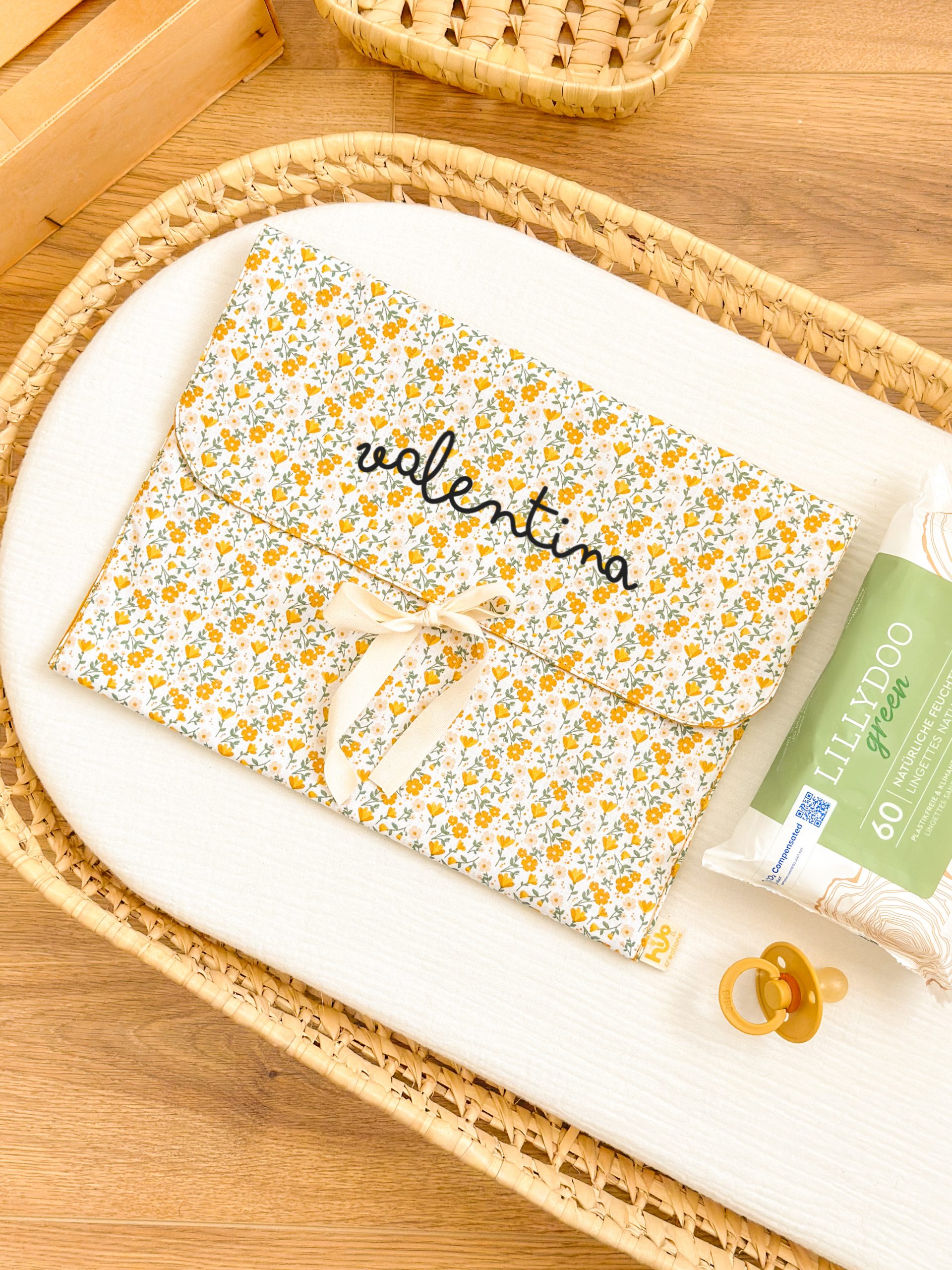 ¡La bolsita perfecta para llevar la muda de tu bebé o tu peque! Cómoda y ligera, para llevarla a todas partes y tener su ropita protegida. Y como está personalizada con su nombre podrás llevarla también a la escuela y que no se pierda nada. Nuestra bolsita está hecha totalmente a mano con tela combinada en estampado Flores y lisa 100% algodón. El cierre es tipo lacito.