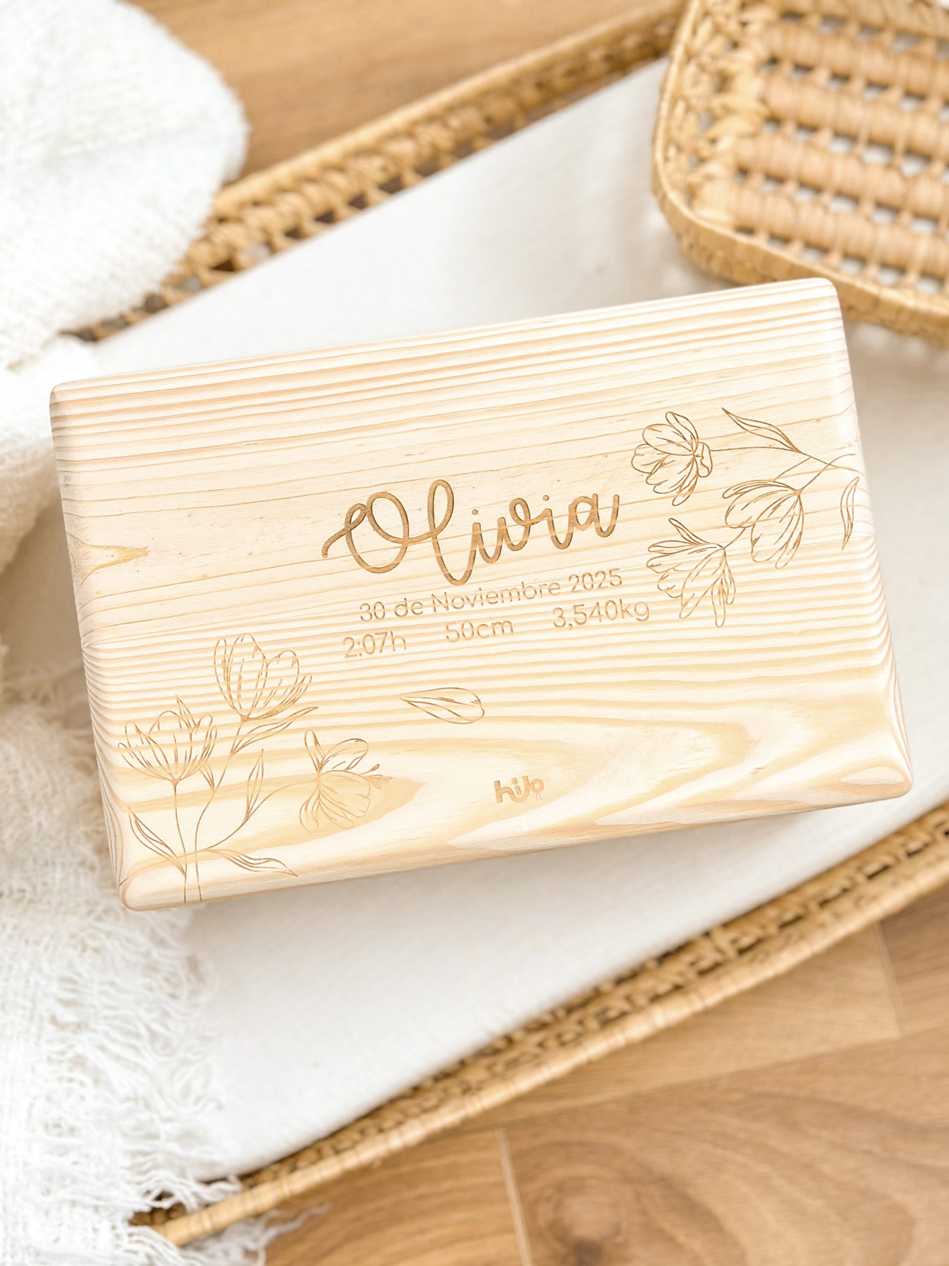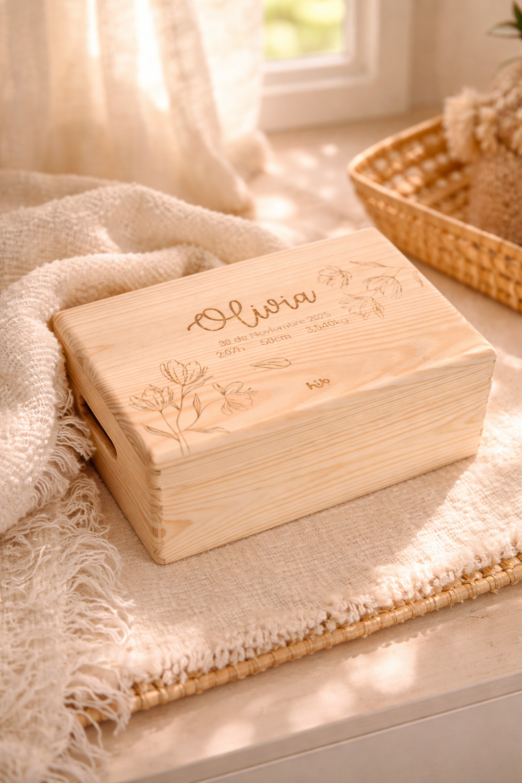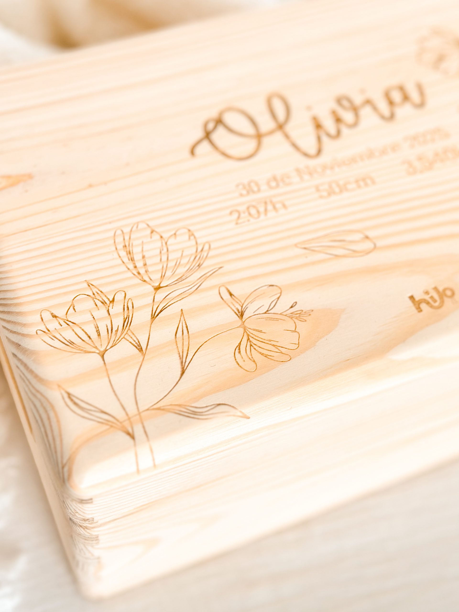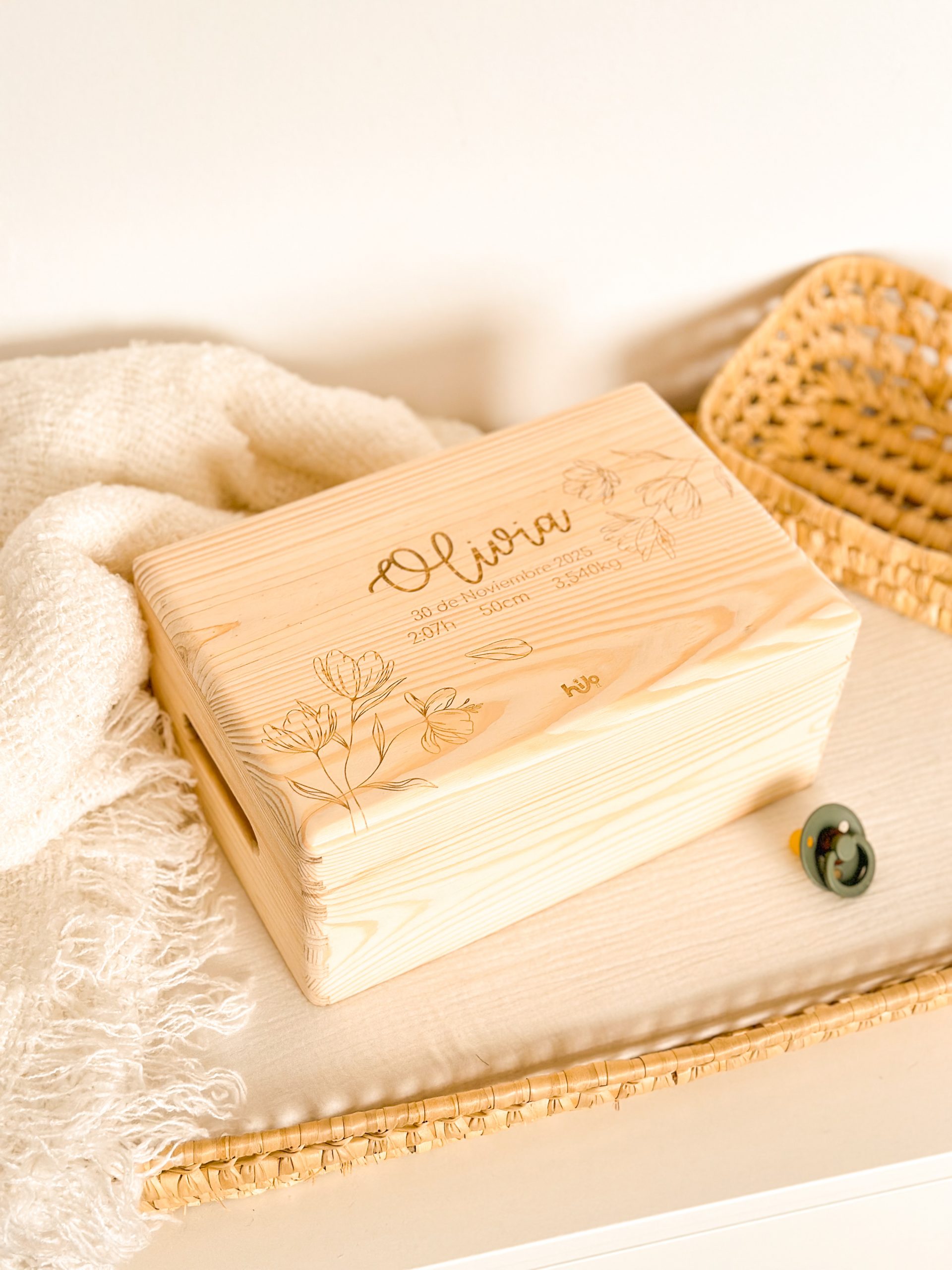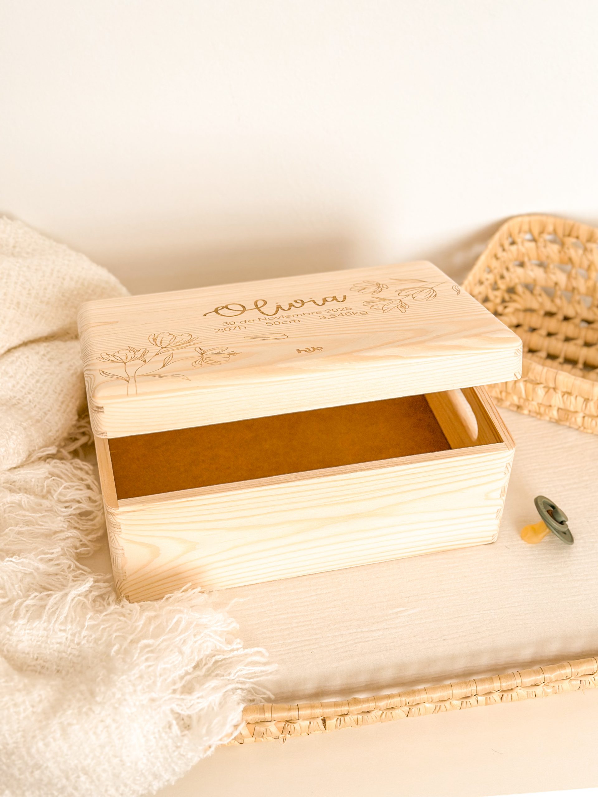 En esta preciosa caja de nacimiento personalizada podrás guardar para siempre las ecografías, fotos, ropita, muñecos y todo tipo de recuerdos de tu bebé. Personalízala con su nombre grabado en madera.