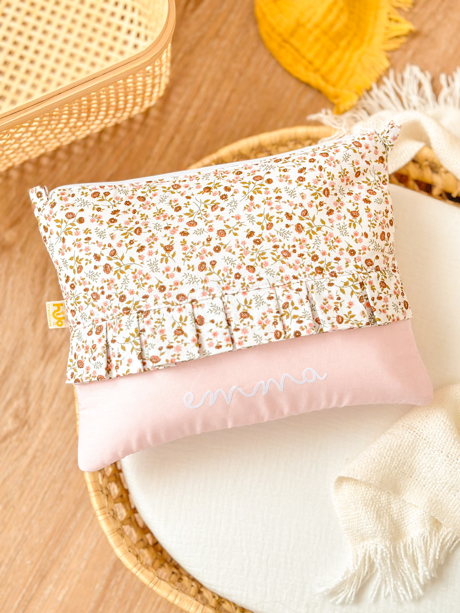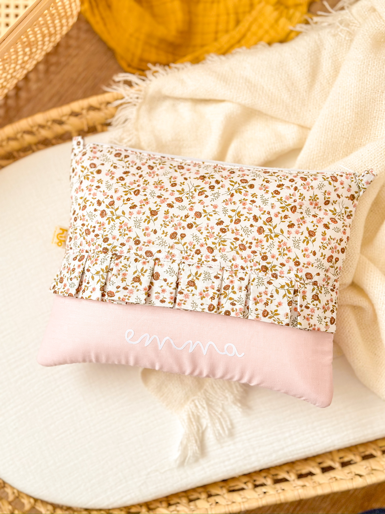 Nuestro Neceser Volantes es el complemento perfecto para llevar en el bolso de tu bebé, podrás guardar todo lo necesario para su higiene: toallitas, pañales, crema, colonia, pañuelos…Tiene un cierre con cremallera para que no pierdas nada y su diseño Flores con volantes lo convierte en el neceser más tierno y adorable. Y como está personalizado con el nombre del/la peque es un producto único. Además lo puedes combinar con el Portapañales y Portadocumentos a juego, ¡para que todo vaya a juego!algodón 100% orgánico. 28 ancho x 22 cm. alto (aprox.).