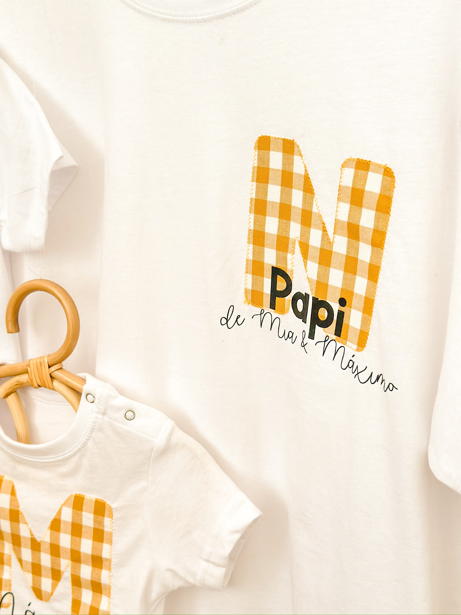 2 camisetas de algodón de color blanco, (una para el peque y otra para el adulto), personalizada con el nombre en vinilo téxtil y la inicial cosida con el estampado escogido.